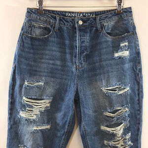 Vanilla Star 90s Boyfriend Jeans Womens 15 Medium Wash Distressed Cotton Denim. Classic 5 pocket design. Button and zip fly closure. 100% Cotton. Pre-owned Condition- no flaws, no rips, stains, or holes.