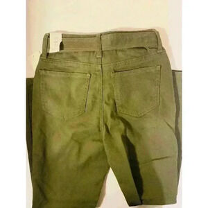 Zipper and button closure at front; belt loops