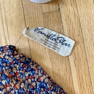 Sweet and feminine, this Vanilla Star cami features a ditsy floral print on sheer chiffon with charming ribbon tie straps and lace trim. Perfect for layering or wearing solo on warm days, this lightweight piece adds a delicate boho flair to any casual outfit.