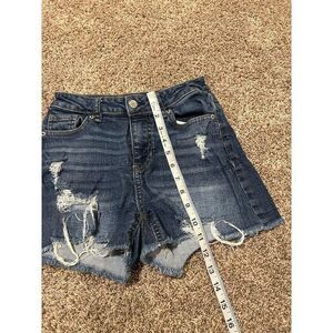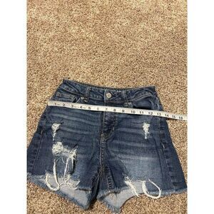 Vanilla Star offers these juniors' cut-off shorts in a solid blue color, perfect for casual summer wear. Made from denim, they feature a mid-rise fit with distressed detailing and a frayed hem. The shorts have a 5-pocket design and a button closure, with a dark fabric wash. They are machine washable and come in a size 1J shortie. This item is pre-owned.