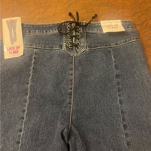 These are Vanilla Star jeans. They have a lace up in the back and a nice flare on bottom. Waist to bottom measures 42 inches. Waist 31/ 13 juniors. Brand new with tags.