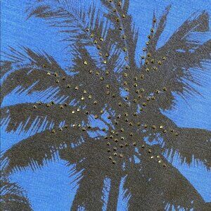 Vanilla Sugar Asymmetrical Tank Top. Women's tag size medium. Rayon / spandex blend. Very stretchy, flowy material. Royal blue with black silk screen palm trees and 'vacation forever'. Palm trees have small beads.