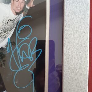 Vanilla Ice 8x10-Beautifully framed in a silver brushed frame measuring approximately 14 1/4" x 17 1/4" overall. Includes a Certificate of Authenticity and a tamper proof hologram on the picture itself by James Spence Authentication (JSA). JSA was present for the signing of this item. This was hand-signed in blue paint pen by Vanilla Ice. Frame and glass have been professionally treated. Care instructions are provided on frame-back.