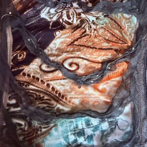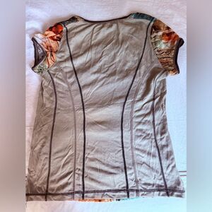 Vanilla b. Women’s cap sleeve embellished top. Patterned center with angled shear ribbons with rhinestones. Sides & back stitching details. Very unique. Made in Italy.