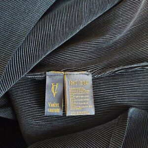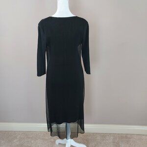 Vanite Couture Black Pleated Sheer Layered Midi Dress. 83% polyester 17% spandex. One size fits most. Sheer layered. 1/2 sleeve length. Knee length. Pit to pit 15". Dress length 39" Layer length 44". Purchased but never worn. Excellent condition.