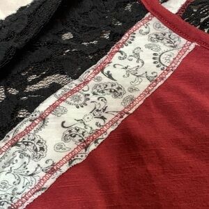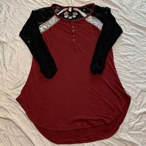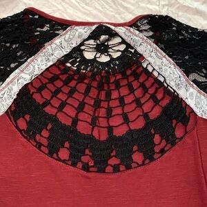 Vanity size small,red, three quarter length sleeve, shirt with lace sleeves and back