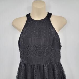 Keywords: lace dress, halter dress, black dress, sleeveless dress, A-line dress, fit and flare dress, party dress, cocktail dress, formal dress, summer dress, occasion dress, womens dress, little black dress, y2k, coastal cowgirl, cottage