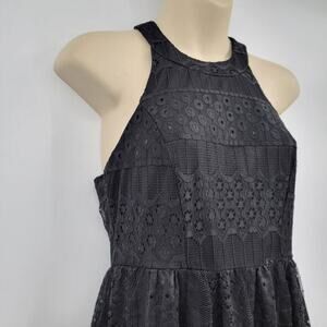 Sophisticated halter dress rendered in intricate black lace. The design features a flattering A-line silhouette and sleeveless cut, perfect for warm weather or special occasions. The dress has a halter neckline, creating a chic and modern look.