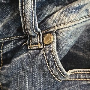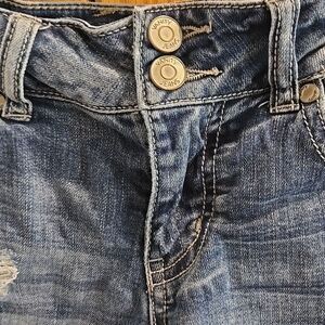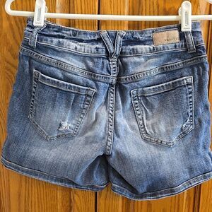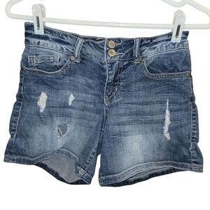 Trendy distressed jean shorts. Classic blue hue. Perfect for casual wear