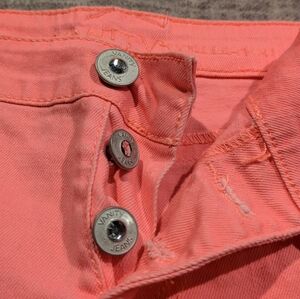 Chic coral jeans featuring stylish button accents. Perfect for casual outings. Y2K vibes. sequin pocket detail.