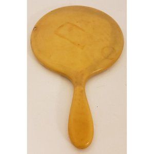 This vintage 1940's three piece vanity set includes a celluloid powder box (5" diameter, 2" tall), a men's brush (4½"x 2¼"x 1¼") and a hand held mirror (9" long, 5½" wide, with a ½" depth. The mirror is intact but the frame is discolored and damaged- See photos please. Combined weight: 1lb.