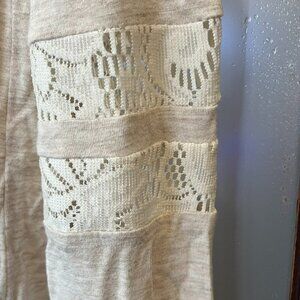 Soft and stylish long sleeve top by Vanity Essentials in a light oatmeal/beige color. Features delicate floral lace across the upper chest and shoulders, plus two horizontal lace panels wrapping around each sleeve for added texture and charm. Lightweight and perfect for layering.