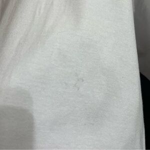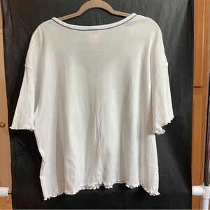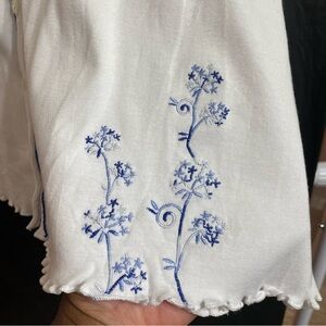 100% cotton white pajama top with blue floral embroidery. Features button-up front and relaxed fit. Good preowned condition with two flaws(stains)see last two photos. Approximate measurements below: