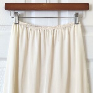 VTG and straight out of the 80s - This beautiful dainty slip skirt was made in the USA to feature an a-line cut that's meant to be worn high waisted and fall above the knee, giving it a mini length. It has an elastic waistband, a subtle lace trim, and a slit up the left leg. It is cream in color. It is silky and soft. It is extremely thin, lightweight, breathable and comfortable. Classic, simple, retro, and high quality!