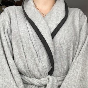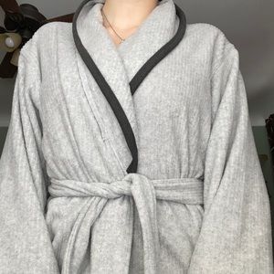 Vanity Fair grey with black outline robe. In great condition. Has pockets. Super comfortable and you can tie it in the inside to whatever size you want. Machine wash cold. 100% Polyester. Made in China