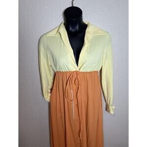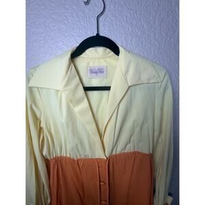 Pale yellow top with orange bottom. Colorbock style, big V and collars. Button front. Buttoned cuffs. Drawstring waist. Single pocket.