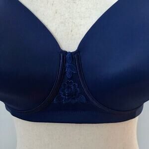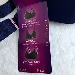 NWT. Navy Full Figure Smoothing Bra for Women Size 40D. Lace detail center gore, wirefree, adjustable slides, light padding, stretchy banded wings, 3 extensions with 4 hooks. Chocker is not included. Pictures are part of description.