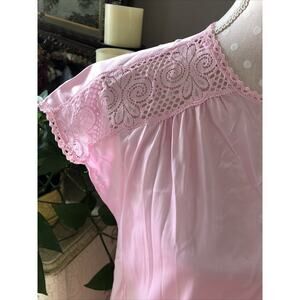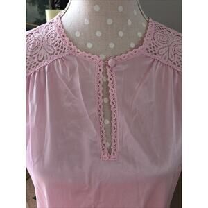 The Vanity Fair Nylon Gown & Robe Set in pink features a sleeveless design with lace trim and a keyhole detail. This vintage-inspired chemise set is made of lightweight nylon fabric, making it comfortable for a relaxing night's sleep. The set is machine washable for easy care and is designed in an oversized XS size, perfect for a smaller frame. Made in the United States by Vanity Fair, this robe and gown set exudes a classic elegance and sophistication.