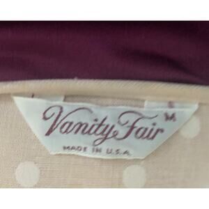 This is a vintage Vanity Fair nightgown set from the 1970s in a size medium. The set includes a burgundy and pink nylon nightgown and robe, both with a simple and cute design. The nightgown has a chest size of 20" (armpit to armpit) and a shoulder to hem length of 38". It is suitable for eveningwear and was made in the United States.