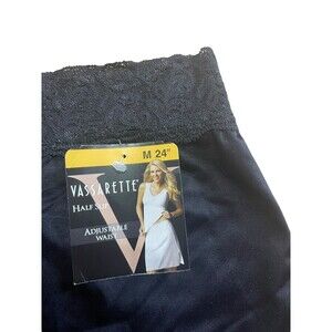 This is a sexy, silky black lace half slip by Vanity Fair, featuring a 11.5" slit and 2" elastic stretch lace waist. The slip is a size Medium and measures approximately 24" long, in a classic Vanity Fair style.