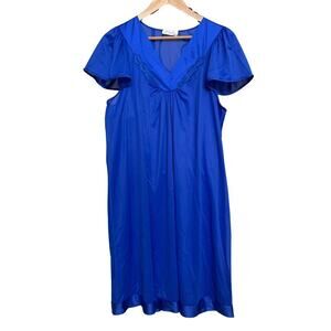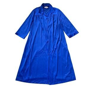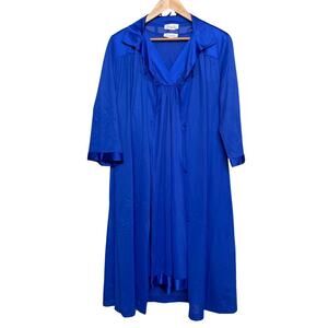 This stunning vintage Vanity Fair boudoir set includes a silky soft nightgown and matching robe, crafted in a gorgeous royal blue nylon tricot. Made in the USA, this set features a silky soft nightgown with delicate tonal embroidery at the neckline and a matching robe with satin trim and button-front closure. Both pieces are in excellent vintage condition with minimal signs of wear.