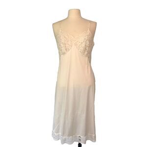 Womens vintage full length slip. Adjustable straps with metal slider. See through lace at bust. A-line with 2" lace trim on hem.