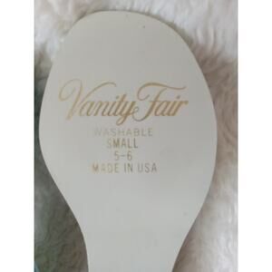 This is a pair of women's satin house slippers with a casual design and Art Deco elements. The slippers are in a delicate blue color and feature a comfortable wedge heel. They are sized 5-6 US and were made in the United States. This item is an original piece, produced by a brand with a long history of excellent products - Vanity Fair. The slippers are perfect for wearing around the house and complement any lingerie outfit.