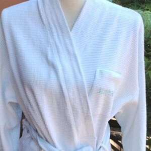 Like NEW. Waffle weave cotton blend fabric in this wrap robe. Inside tie. Outside tie. One size measures 50 at chest, 46 at waist , tie here, 47 at hips, 38 long from shoulder to hem. Sleeves 17. The pocket is embroidered with "body breath." NWT Elizabeth Arden 100 % cotton spa slippers, size L (9-10.) Treat yourself ( or someone else ) to a special day.
