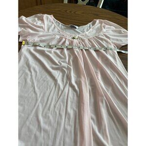 Vanity Fair vintage pink night gown and robe size S/M. Night gown is Small. Has scoop neck with rose in center. Robe is Medium. Robe has 4 buttons and a snap in front. Has lace at top. Made in U.S.A. Good pre-owned condition.