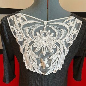 Elegant gray ribbed dress. Features a scoop neckline and half sleeves. Perfect for casual outings.