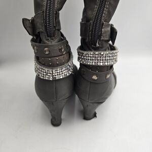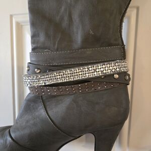 Vanity boots, rhinestone boots, studded gray boots, knee high boots, heeled boots, glam western boots, buckle boots, party boots, statement boots, size 8.5 shoes, womens fashion boots