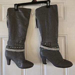Vanity Gray Studded Rhinestone Knee High Boots Heeled Size 8.5 Alla VT