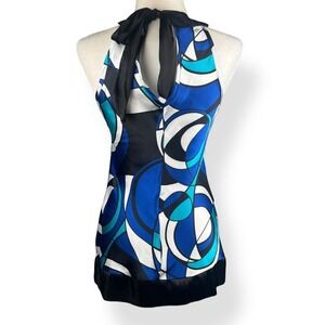 Authentic Y2K 2000s Vanity halter top with blue, teal, and black geometric swirl print.
