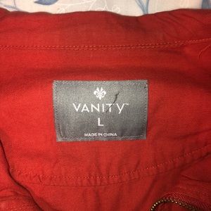 Burnt orange/rust colored Vanity jacket. This is a great jacket to wear as a statement piece. No damage, just worn. Good condition. It is able to cinch around the waist area for your ideal fit.