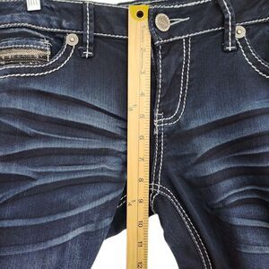 The Vanity Premium Collection Flare Women's Jeans in dark blue feature embellishments like studded accents, button details, embroidered designs, sequins, and logos. Made of a cotton blend denim fabric with a dark wash, these mid-rise jeans have a regular fit with a flared style and a 5-pocket design. Machine washable, these stylish jeans are designed for women in a size 29 with a 33-inch inseam. Perfect for adding a touch of edgy flair to any wardrobe.