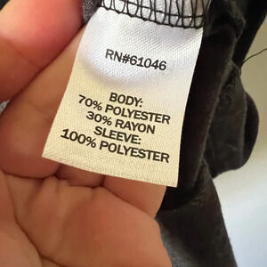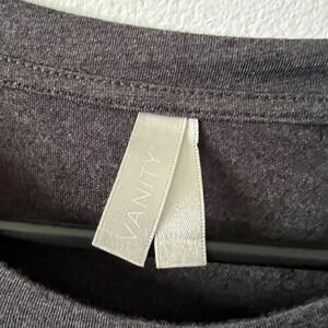 Vanity branded raglan top with grey front and back panels and black sheer contrasting 3/4 sleeves with rhinestone detail