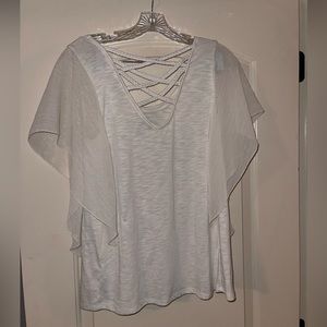 Cream cooler blouse from Vanity. This features a cris cross braided rope back and flowy sleeves. Size M. Good condition! Offers accepted, please ask any other questions you have (: