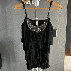 It has the ruffle front and a beautiful beaded neckline that is perfect without adding a necklace!