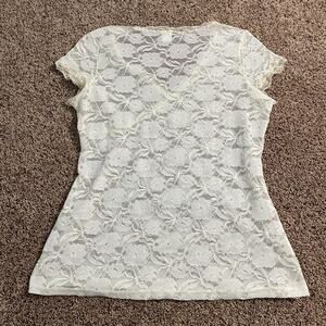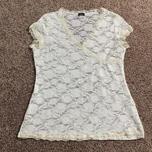 Vanity Shirt Womens XL White Lace Sheer Floral Short Sleeve Sequin Trim Top