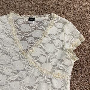 Vanity Shirt Womens XL White Lace Sheer Floral Short Sleeve Sequin Trim Top Y2K