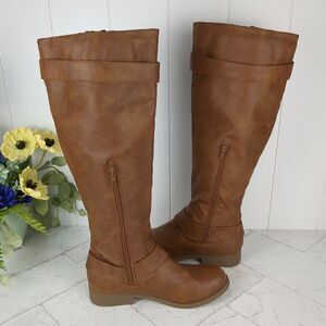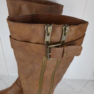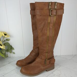 Vanity Side Buckle Zip Up Knee High Riding Boots Brown Faux Leather 7M Fall Boho