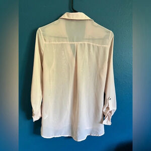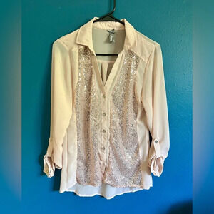 Vanity branded blouse with sheer fabric, all-over sequins on front panel, long sleeves with button and strap option to roll to 3/4 length, button up front.