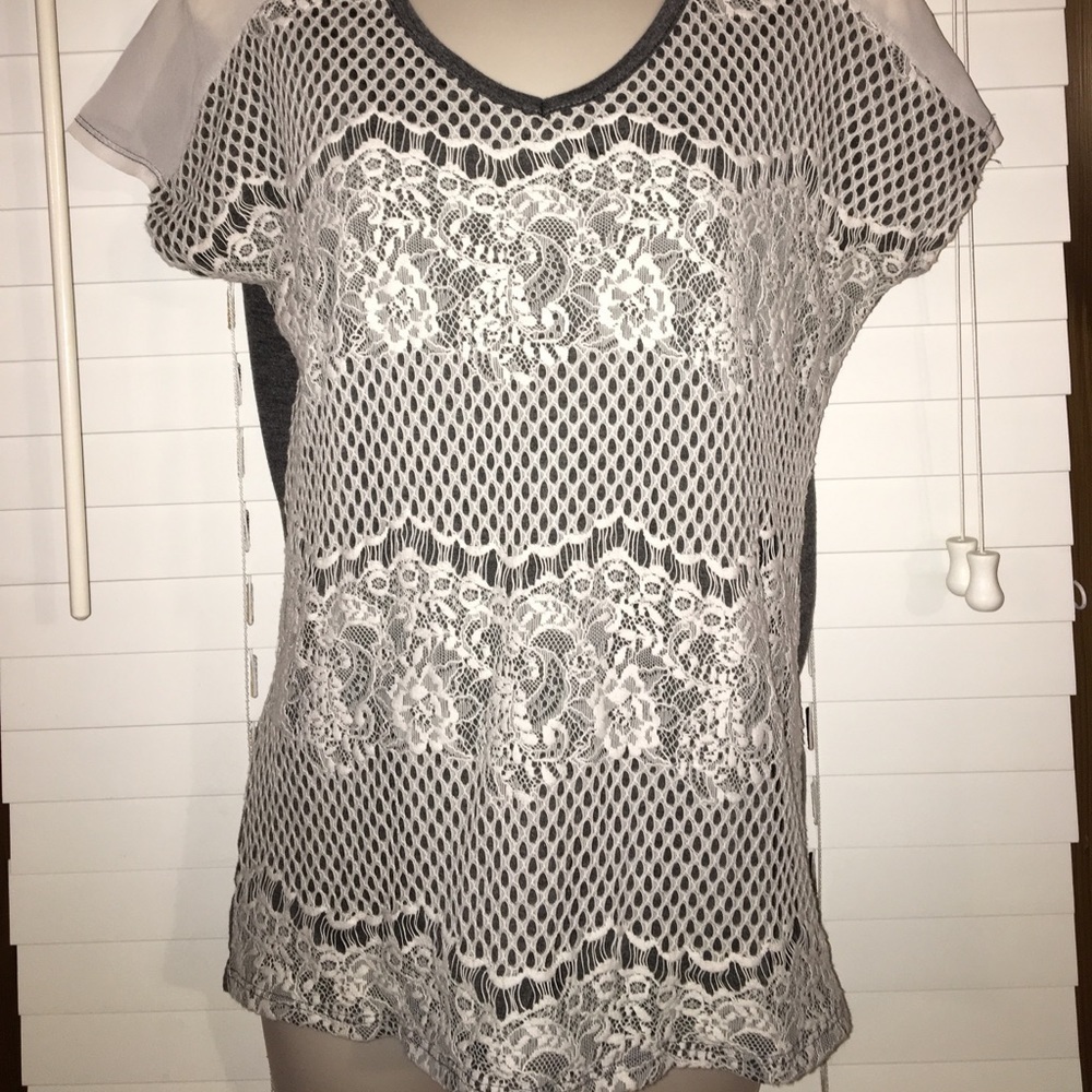 Women's size small Vanity top. It's gray with off white lace on the front. It's 24 inches long and 31 inches in the chest all the way around . I do not guarantee fit