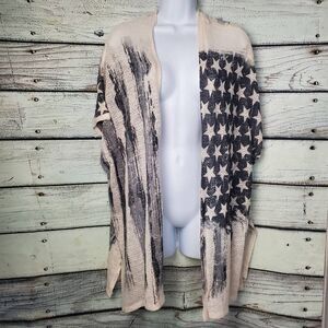 Women’s Vanity open front cardigan with distressed American flag stars and stripes print. Lightweight, draped design with an asymmetrical hemline. Made of 95% polyester / 5% spandex for comfort and stretch. Perfect for layering and patriotic holidays.