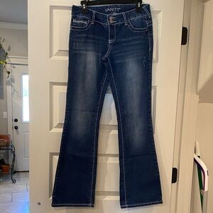 Chic boot cut jeans in dark blue. Perfect for casual wear. Features stylish stitching.
