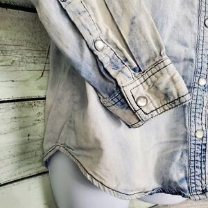 Classic light wash denim chambray shirt by Vanity. Features snap button front, dual chest flap pockets, and long sleeves. Perfect for layering or casual wear.