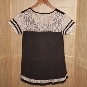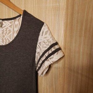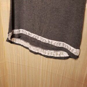Vanity women’s grey tee with lace detail medium. Gently used condition, care tag is missing. Measurements are: 26 ½" from shoulder to hem, and 18" from armpit to armpit.