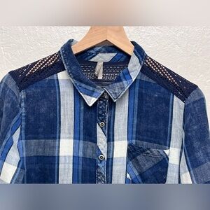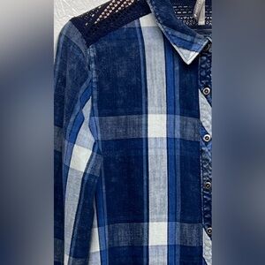Women’s Long Sleeve Button Up Flannel Shirt Button on sleeves and inside tab to roll sleeves up. Navy blue see thru lace on shoulders. Button front and cuffs. One open front pocket.