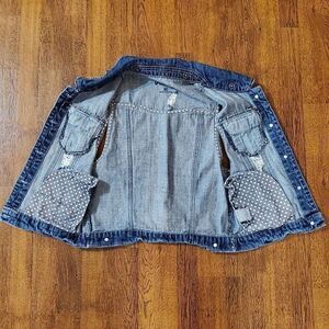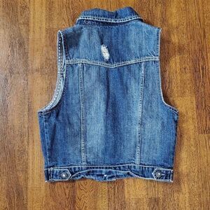 Vanity Women Sz Medium Denim Vest Distressed Bejeweled. Not sure what snaps on the collar are for