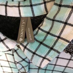 Vanity Womens Button Down Plaid Shirt with Sequins Accent Size Small